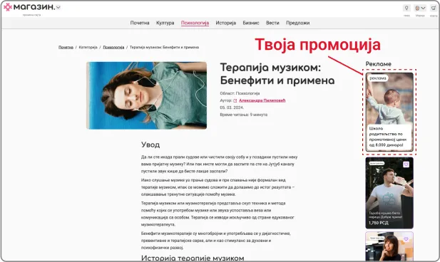 Опис услуге: Повећај видљивост твог бренда кроз рекламе постављене у sidebar-у на нашим најпопуларнијим категоријама. Овај облик оглашавања осигурава да твој бренд буде примећен од стране корисника који су заинтересовани за специфичне теме.